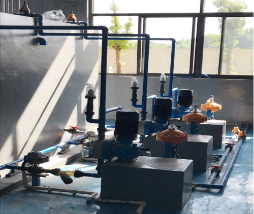 配矾系统:所需要原液池一个,并且配有两只液下泵(一用一备),配液池子两只,每个池子配有进水阀门、进液阀门、气冲阀门、液位计各一个,并且气管路上面配有两个空压机(一用一备);